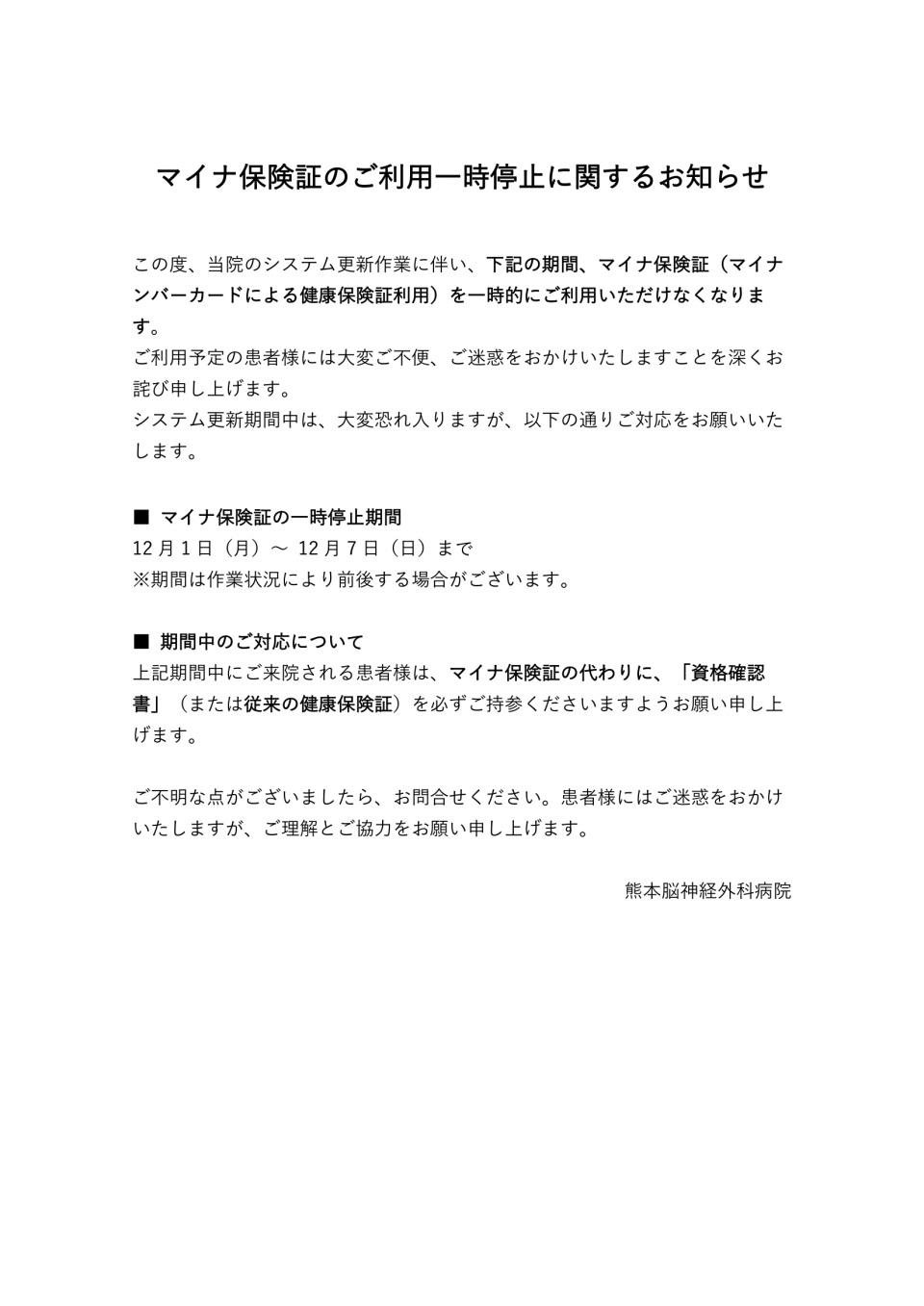 マイナ保険証のご利用一時停止に関するお知らせ