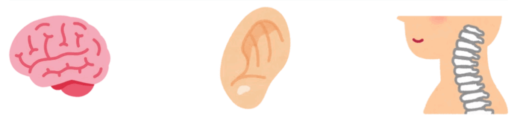 めまいの原因は大きく分けて「脳」「耳」「首」の3つの部位に分けられます。